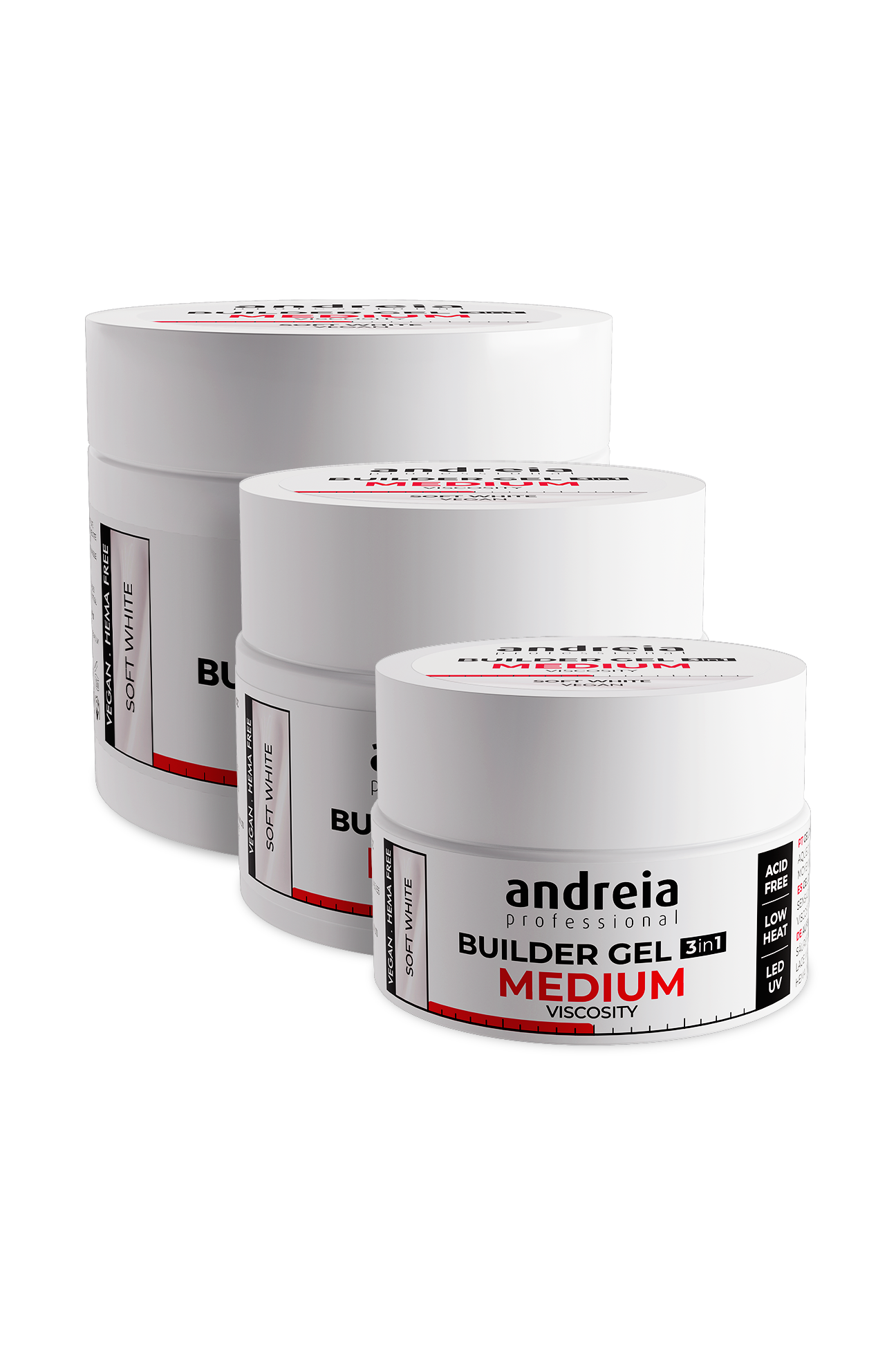 Gel de construção 3 em 1 de média viscosidade e aquecimento nulo. Sem ácidos. É autonivelante e funciona como base, construção e top coat. Textura fluída e resistência muito elevada. Catalisa em LED e UV. Compatível com as restantes viscosidades de gel.