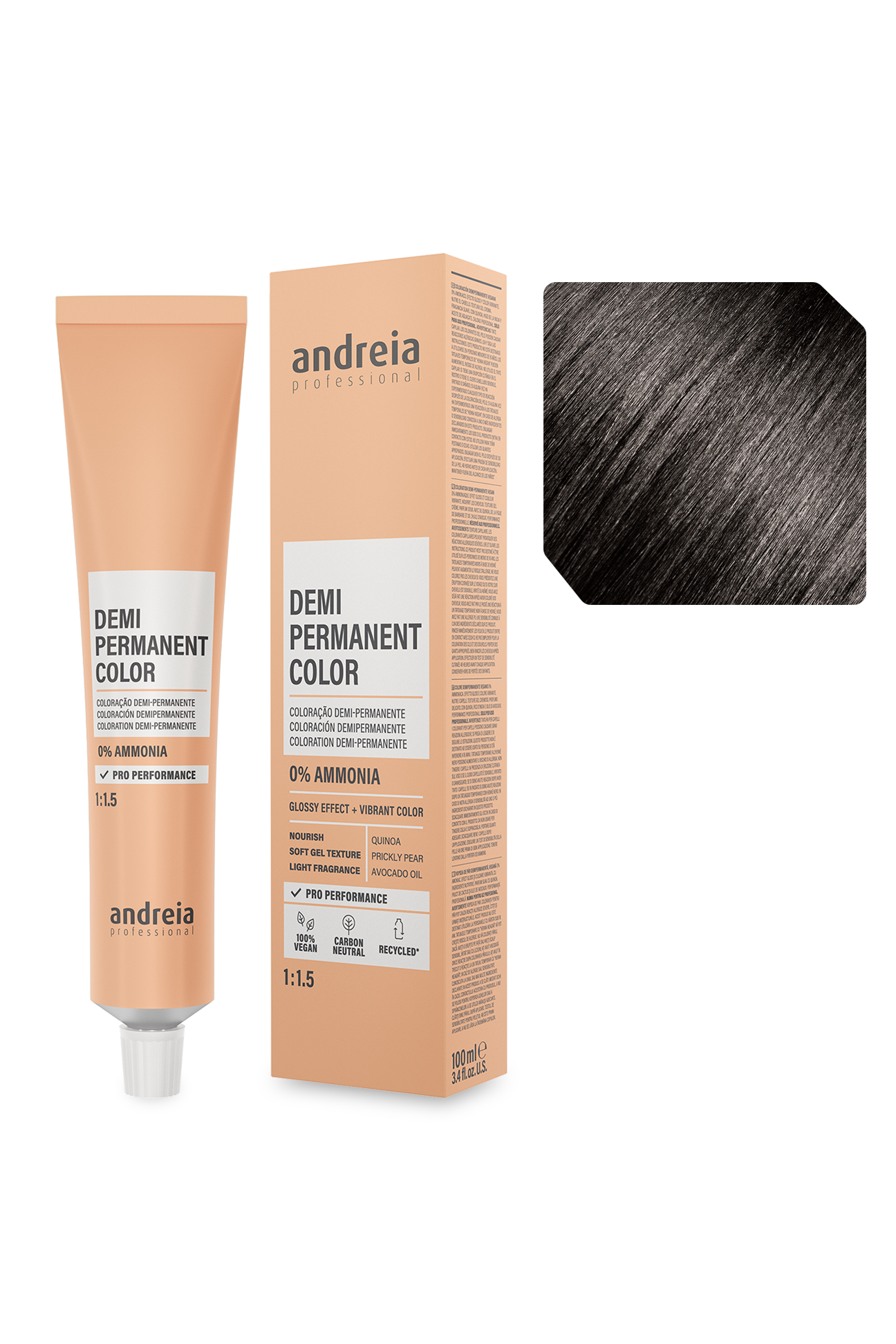Coloração demi-permanente vegan 0% amoníaco. Efeito gloss e cor vibrante. Nutre o cabelo. Textura gel creme. Fragrância suave. Com quinoa, figo da índia e óleo de abacate. Performance profissional.
