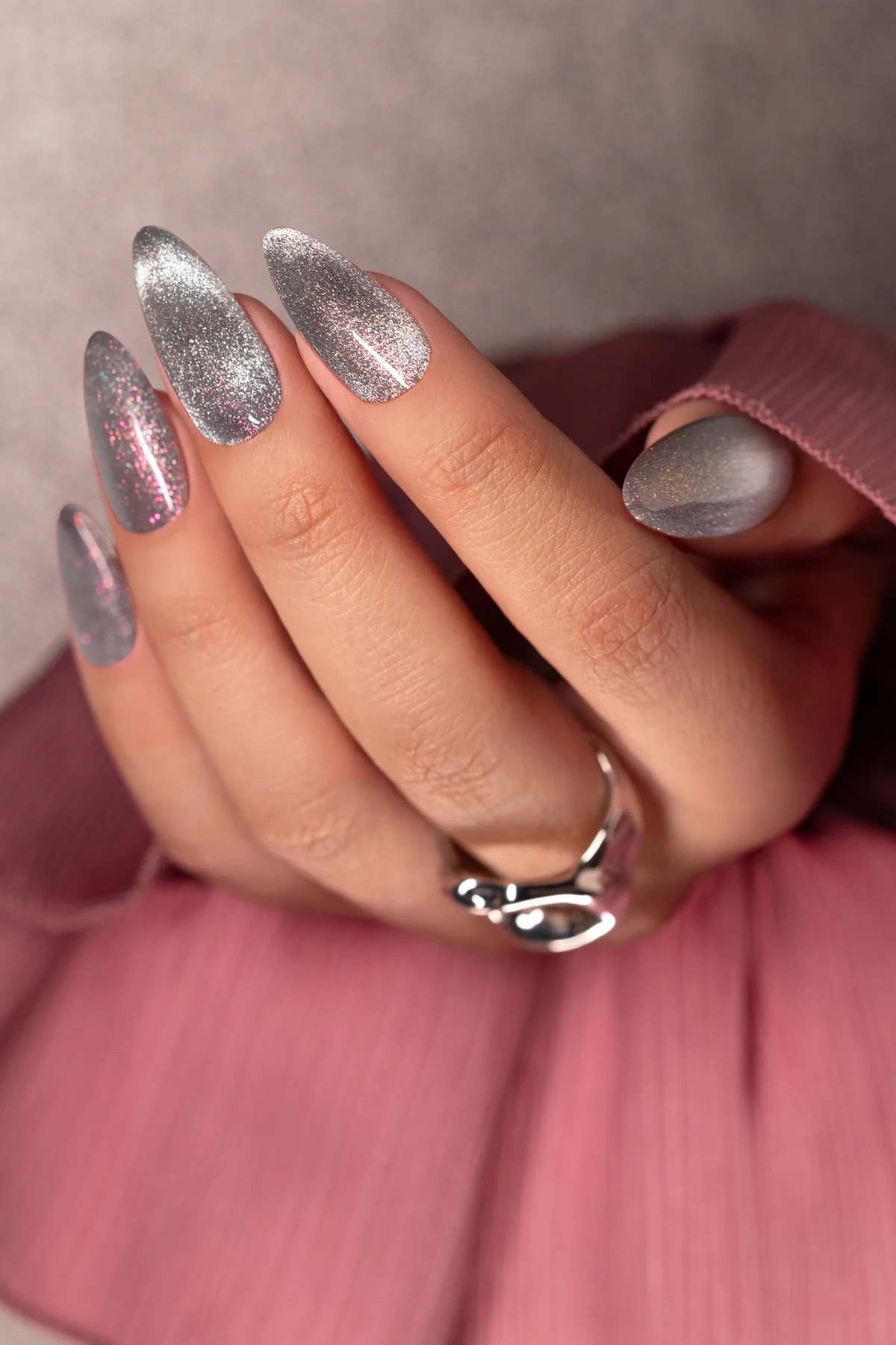 MC1 Cat Eye Effect – Glitter magnético prateado com brilhos rosa.