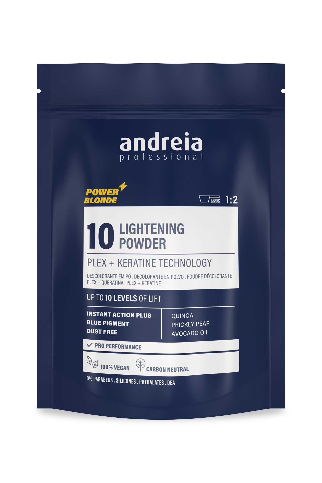 Pó descolorante azul vegan até 10 níveis de aclaramento. Neutraliza tons amarelados. Ação instantânea e proteção da fibra capilar graças à tecnologia plex e queratina. Livre de poeira. Adequada para todas as técnicas de descoloração. Com quinoa, figo da índia e óleo de abacate. Performance profissional. 0% Parabenos, Silicones, Ftalates, DEA. 1:2.