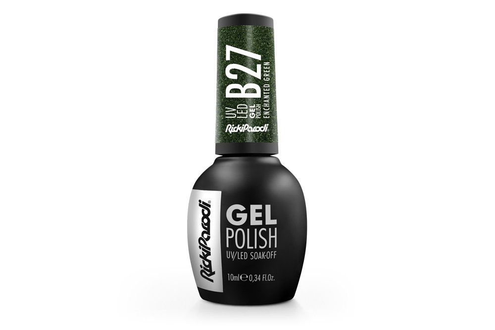 VERDE ESCURO COM GLITTER DOURADO O Verniz Gel B27- Enchanted Green , inspirado na majestosa árvore de Natal, com um verde profundo e glitters dourados que remetem aos enfeites e às luzes festivas. Este tom representa a prosperidade e o espírito de renovação, criando um visual encantador que traz a magia do Natal para as suas unhas.
